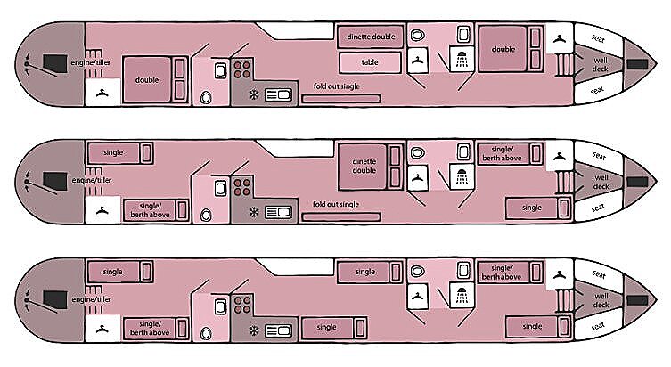 Swallow tilbys i tre ulike layouter. Det er samme båttype, men interiøret tilpasses av teknikere før ankomst, slik at alt er klart når dere går om bord. Gi oss gjerne beskjed om hvilken layout dere ønsker – dette kan fint gjøres også etter at bestillingen er gjennomført.