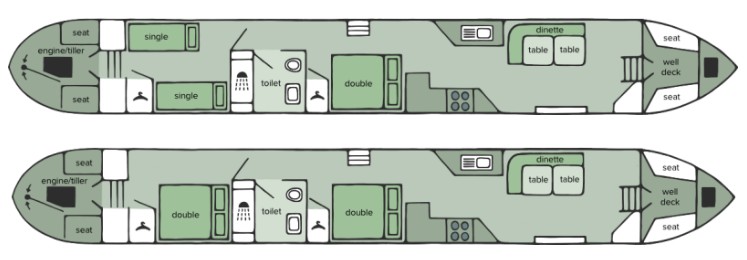 Plover er et utmerket valg for par eller mindre familier som ønsker å nyte en komfortabel og avslappende kanalbåtferie i England. Med smart planløsning, god komfort og lettkjørt design er Plover en svært populær båt – også blant førstegangsreisende.