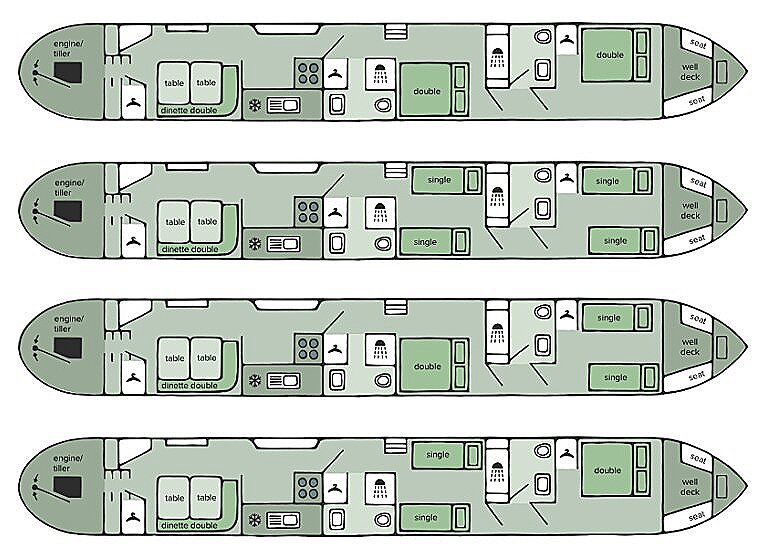 Gull og Sandpiper er perfekte kanalbåter for familier eller mindre grupper som ønsker å nyte en avslappende kanalbåtferie (de har samme layout). Båtene har to separate hytter og tilbyr i tillegg to ekstra soveplasser i den romslige salongen. Ombord finnes to bad, begge med dusj og toalett, noe som gjør reisen komfortabel for alle om bord.