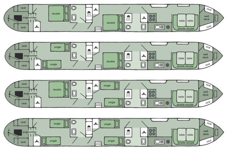 Kanalbåten Lark (samme layout som Thrush) er et utmerket valg for familier eller mindre reisefølger som ønsker en komfortabel ferie langs Englands vakre kanaler. Båten har plass til opptil 6 personer og er godt utstyrt for en avslappende og behagelig kanalbåtferie – enten dere er nybegynnere eller erfarne båtreisende.